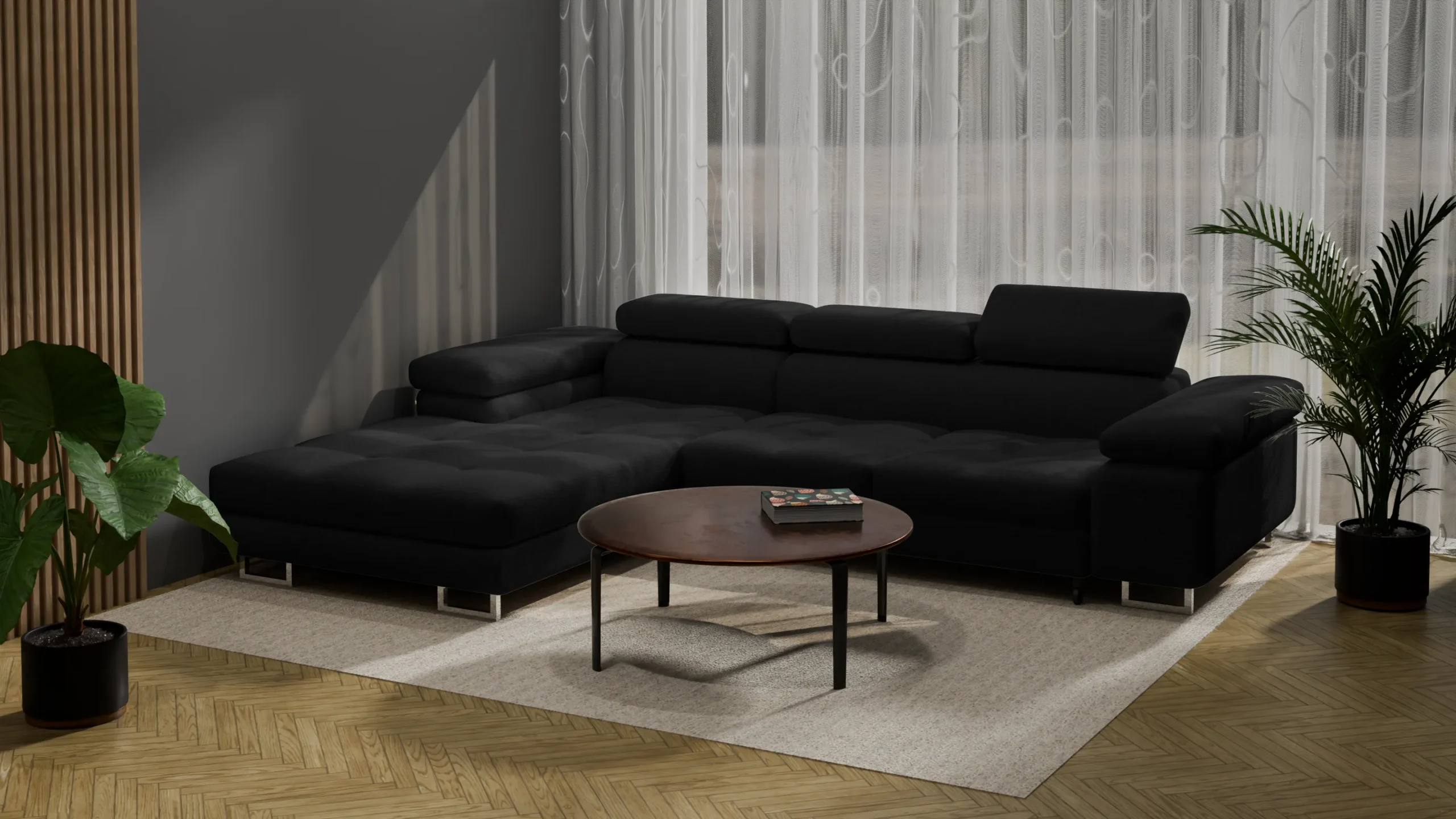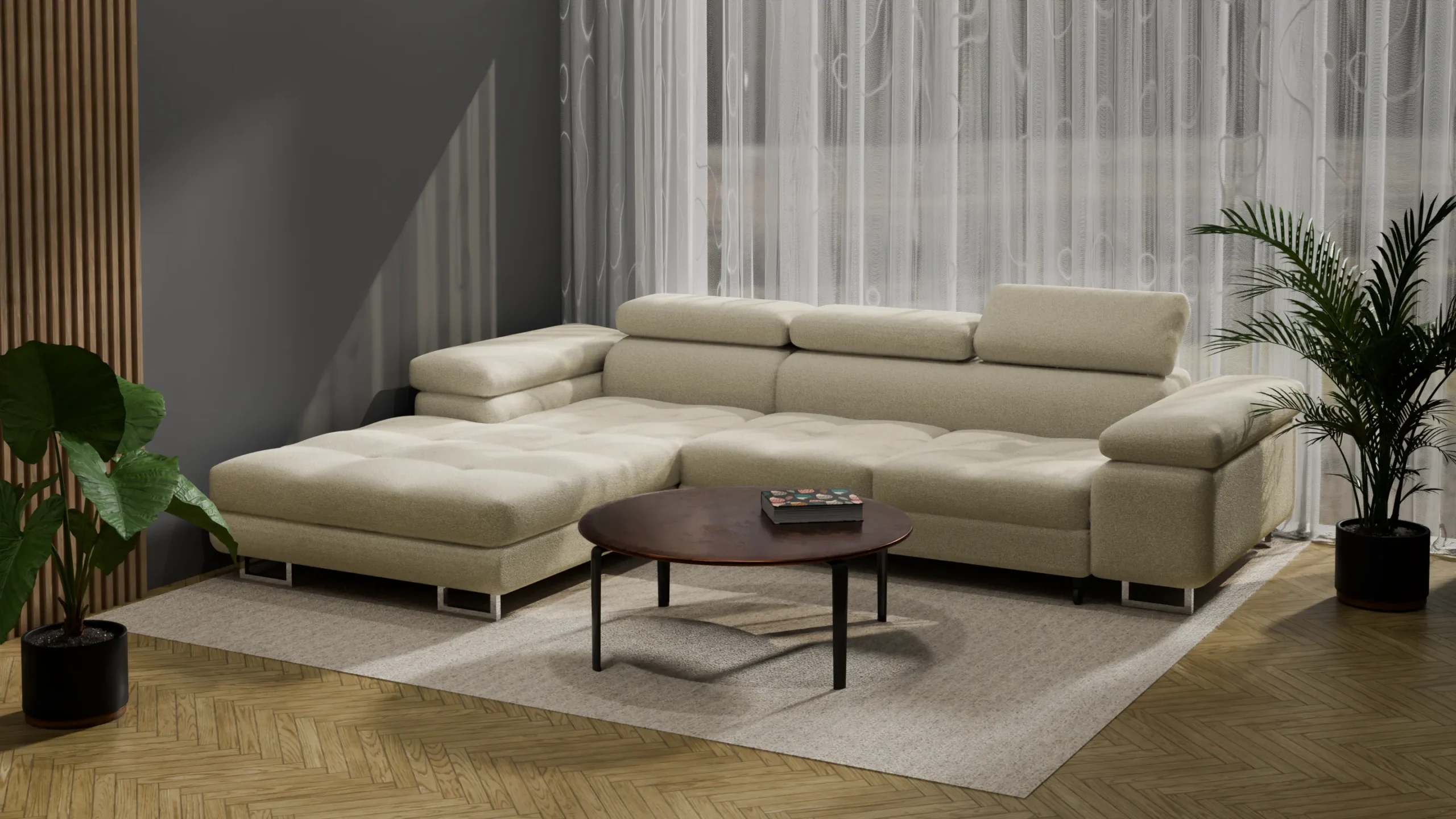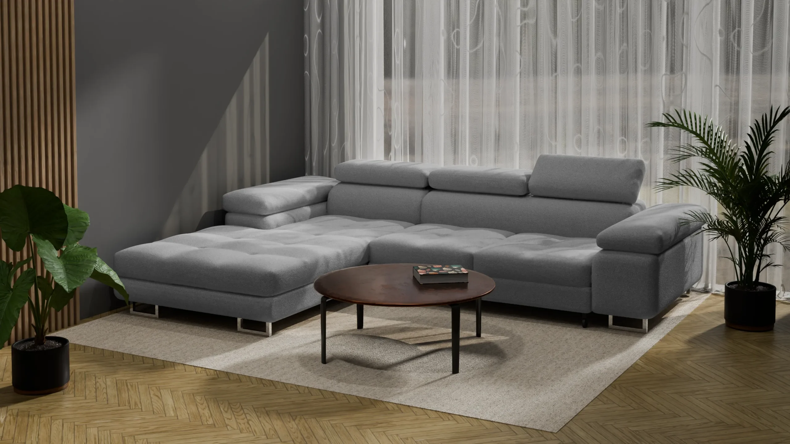 Narożnik Agnes został wyposażony w regulowane zagłówki, które pozwalają dopasować oparcie do indywidualnych potrzeb, zapewniając idealne podparcie dla karku i głowy. Szerokie podłokietniki oraz odpowiednio wyprofilowane siedziska gwarantują wygodę zarówno podczas codziennego odpoczynku, jak i rodzinnych spotkań czy seansów filmowych.